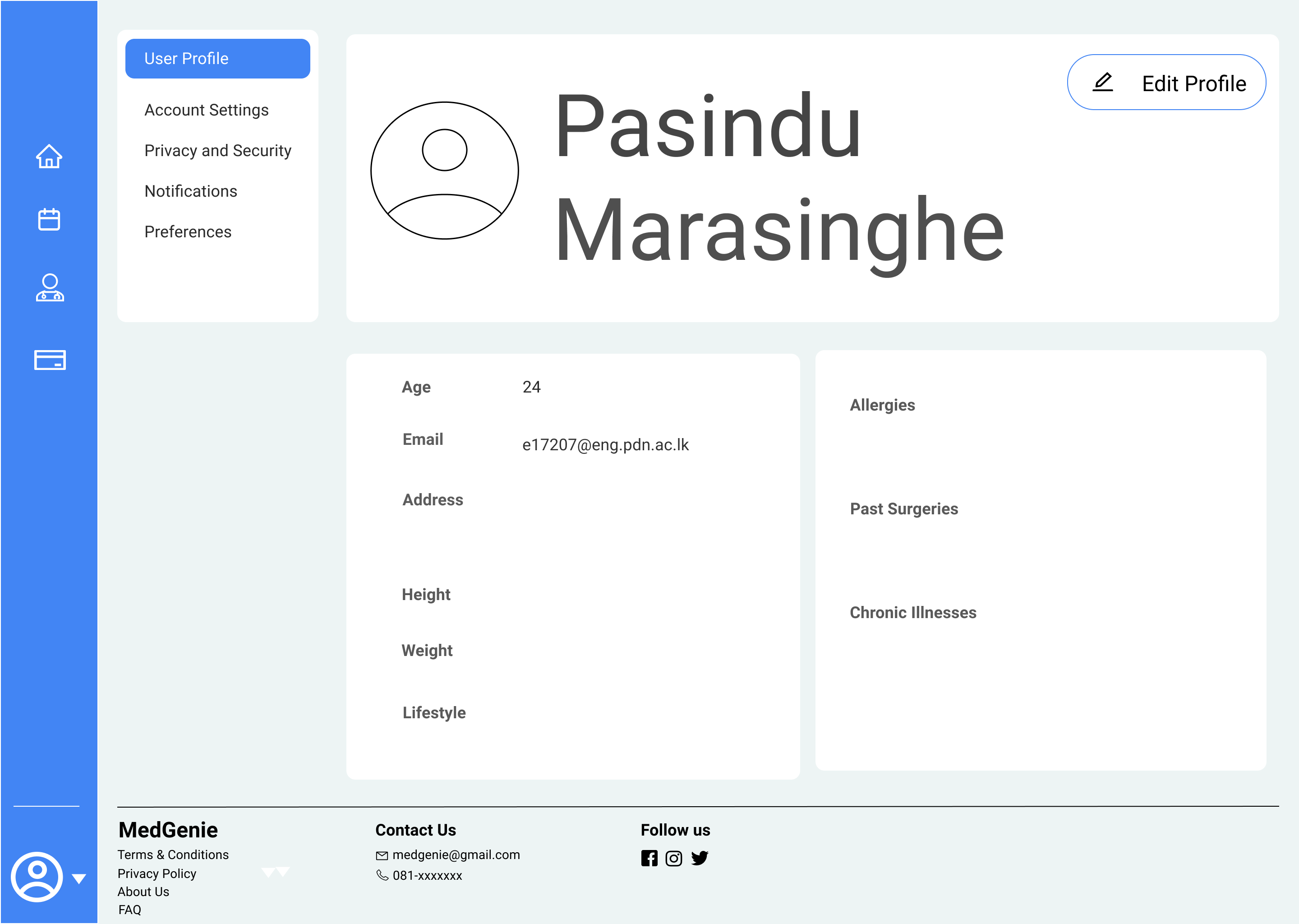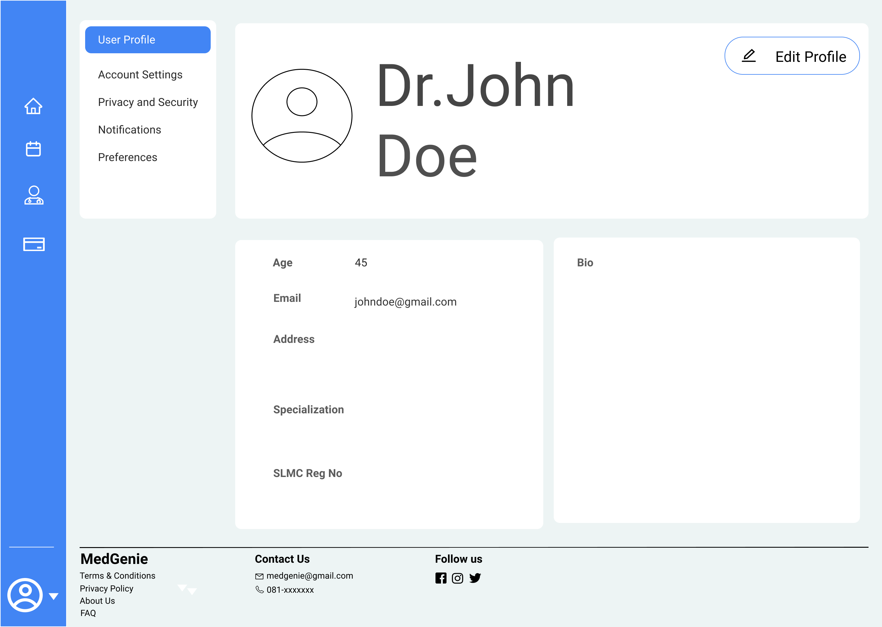 A doctor can access the profile page from the sidebar. Updating the profile details, account setting, etc. can be done from here.