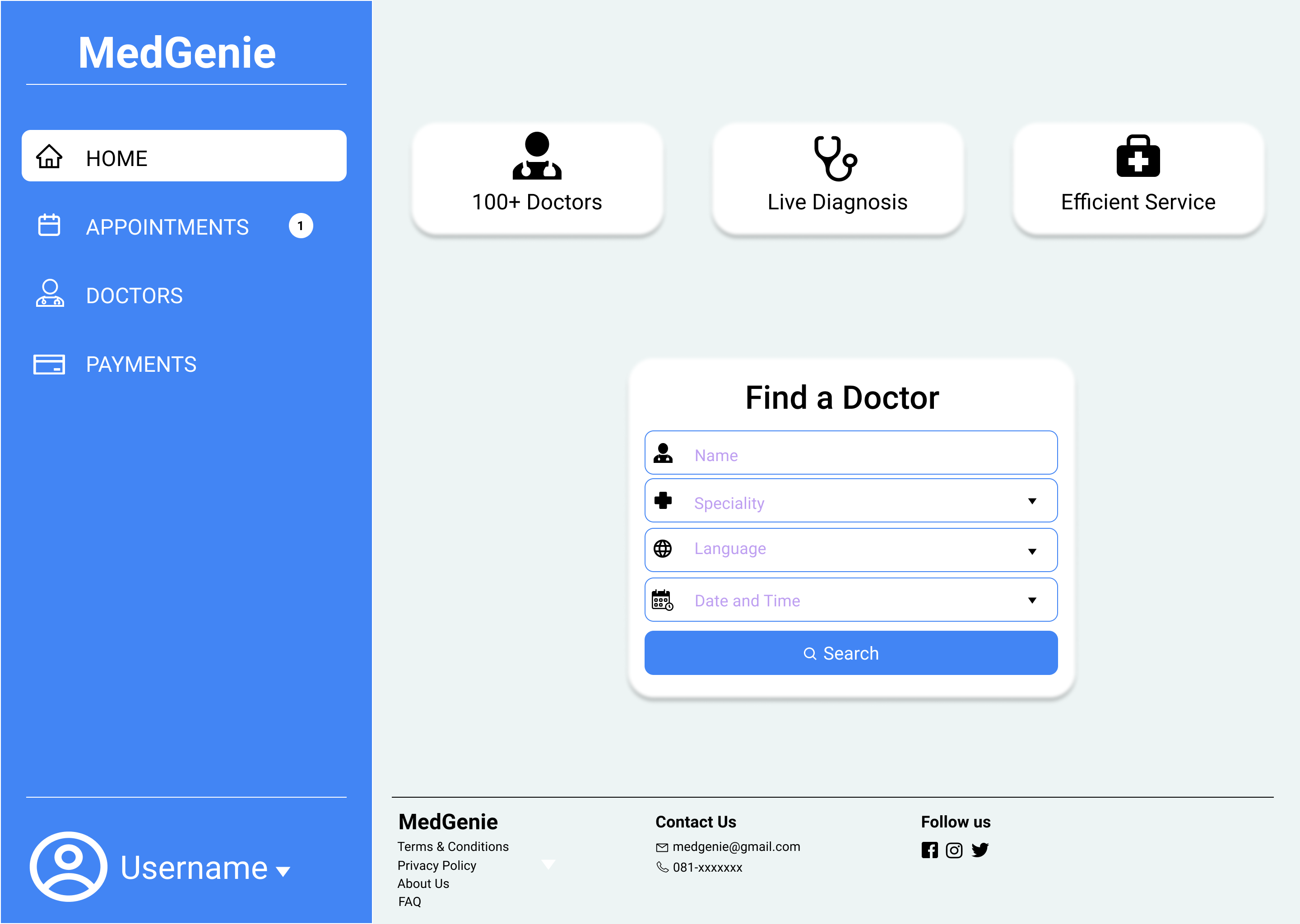 This is the home page of the user profile. The patient can search for a doctor and make an appointment using the search box. The sidebar can be used to nagivate to Appointments, Doctors and Payments. Also the user can access the User Profile page by clicking on the username.