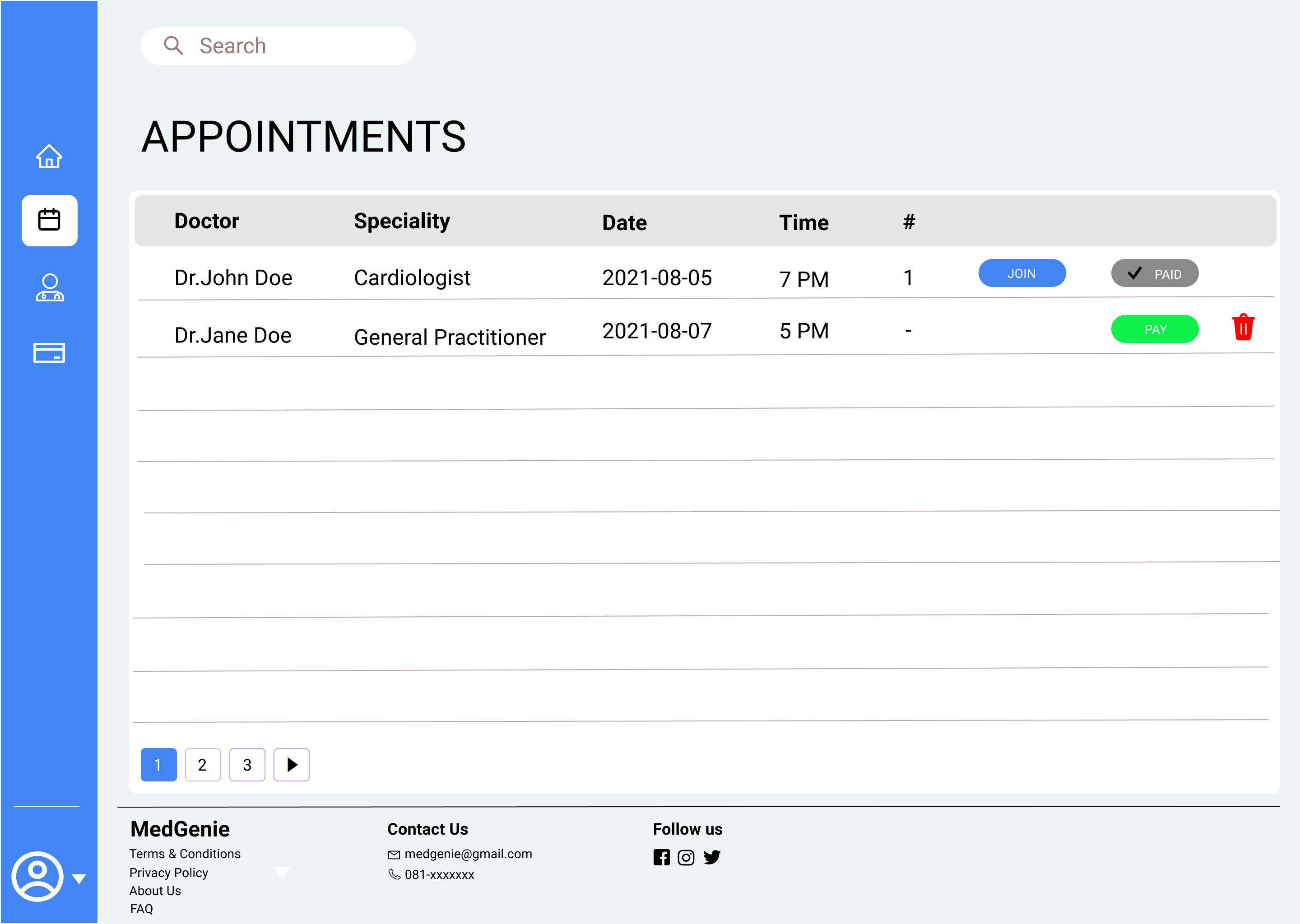This is where all the appointments made by a patient are displayed. A patient can choose either to pay or delete an appointment. A patient should pay for the meeting before the meeting in order for the permission to join the meeting to be granted. The patient has the option to cancel the appointment only before making a payment and if somebody who paid could not make it to the meeting has the option to request for a refund as well.