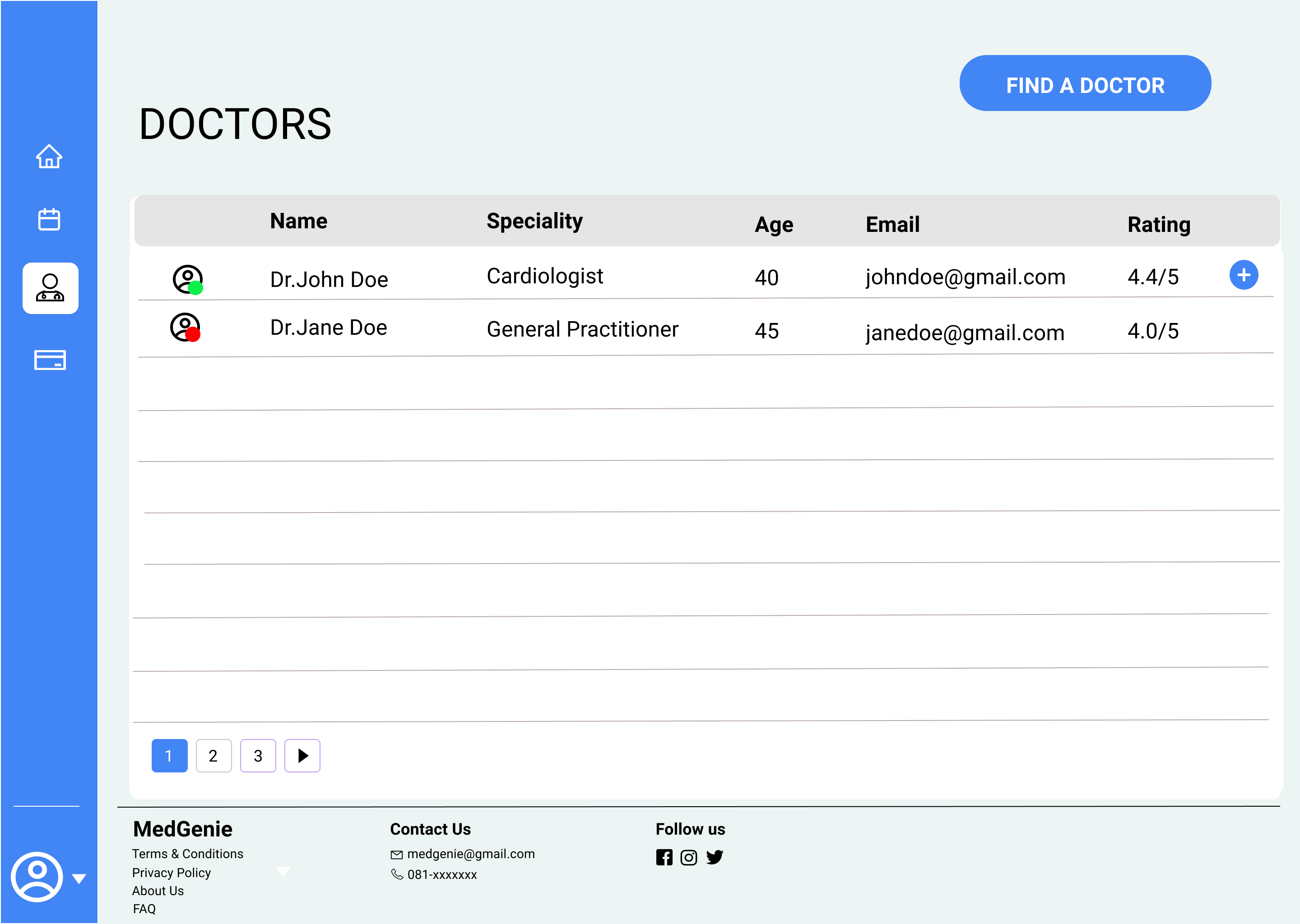 This is where all the doctors in the centre is displayed. Clicking on a doctor’s name will allow a patient to have a look at more details of a doctor. The doctors are ordered according to their ratings given by patients after each session. The patient has the option to search for a doctor as in the homepage or can directly make an appointment by clicking on the (+) button at the end of an entry.