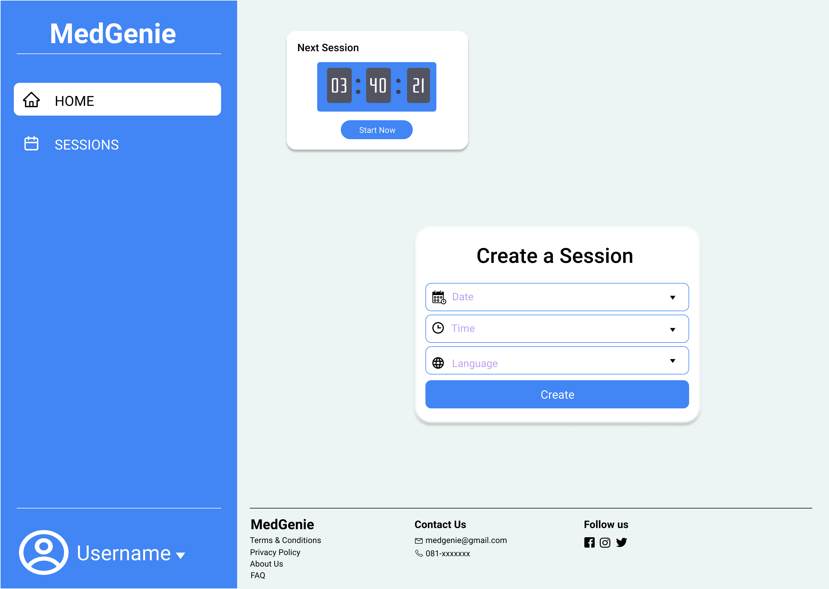 This is the homepage for a doctor. A doctor can create and schedule a session here so that the patients can make appointments. The remaining time for the next session of a doctor is also displayed in the homepage and the doctor can start the session by clicking on ‘Start Session’.
