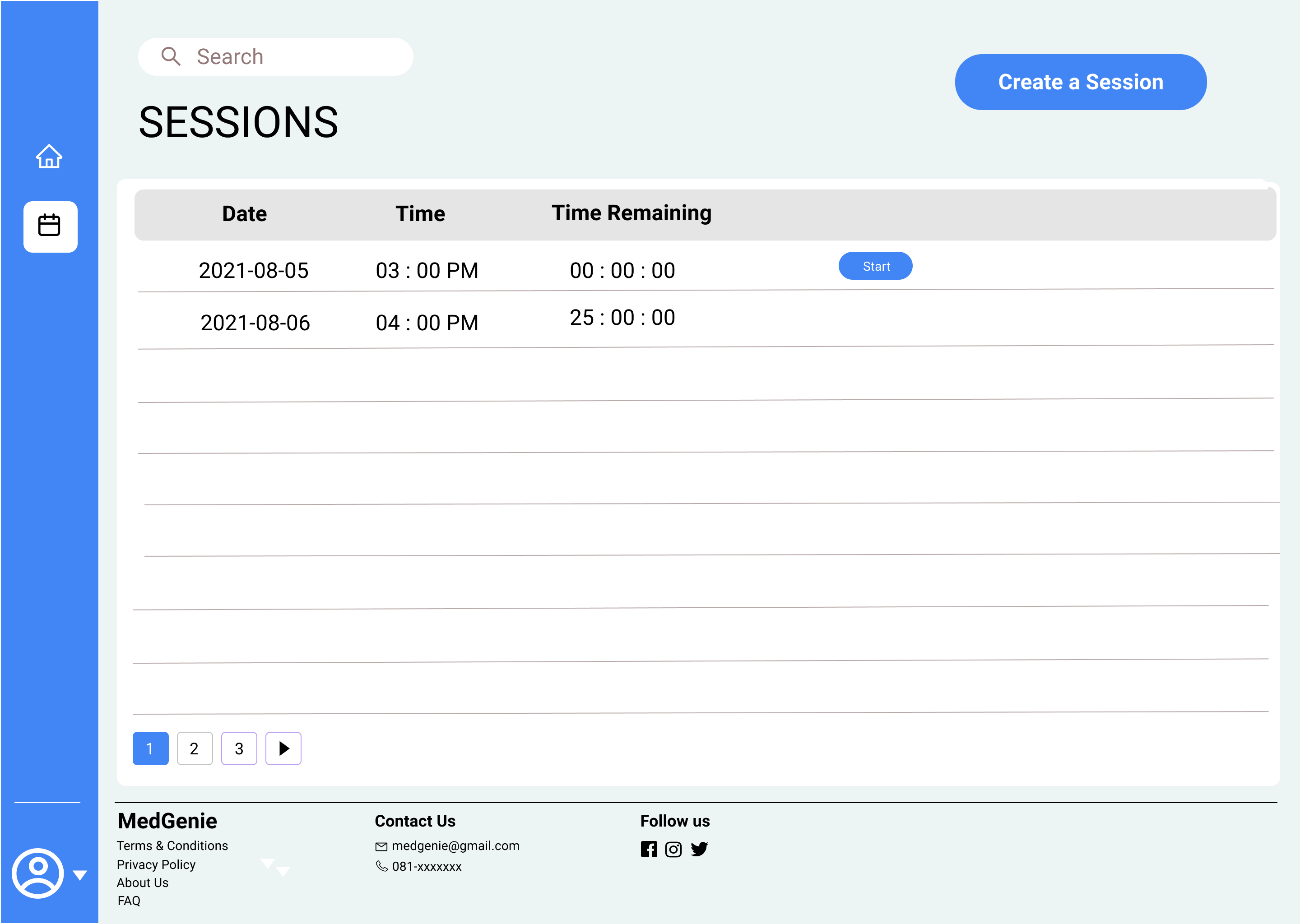 All the sessions that a doctor schedules is listed here and a session can be started from here too. A doctor has the option to create a session from here as well.